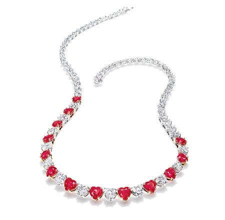 Harry Winston jewelry is guaranteed to be on several celebrities on the red carpet this awards season and they even dressed Fergie when she glamously shined during the Super Bowl. Your girl will feel like a diva in this Ruby and Diamond Heart Necklace with 66 heart-shaped diamonds, 24.34 total carats; 13 heart-shaped rubies, 14.43 total carats in a 18k gold and platinum setting.