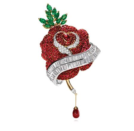 Nothing says Happy Valentine's Day quite like this vibrant Rose Brooch with 312 round, oval and pear-shaped rubies, 20.95 total carats; 11 marquise emeralds, 3.79 total carats; 119 baguette diamonds, 7.81 total carats all in 18k yellow gold and platinum settings.