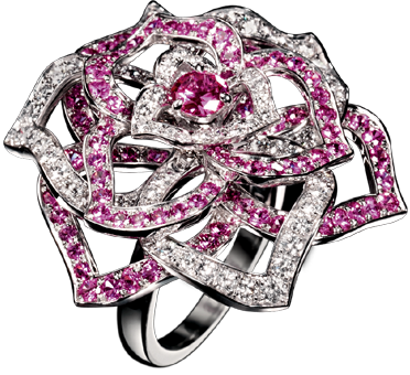 Who needs flowers when you can give her this ring from the Magic Gardens of Piaget collection. Featured is a rose motif ring in 18K white gold, set with brillant-cut pink sapphires and brillant-cut diamonds.
